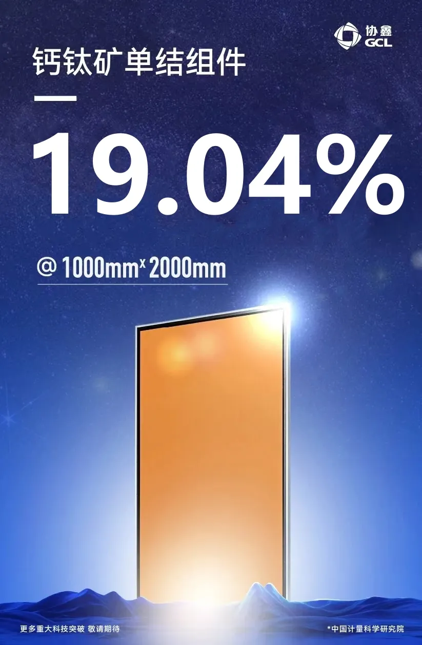 2024年3月6日,協(xié)鑫光電刷新世界紀錄,2平米全尺寸,鈣鈦礦單結組件,穩(wěn)態(tài)效率達到19.04% ----即:單結19.04%@2m² ( 1m×2m),由中國計量院認證。