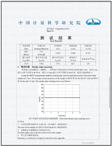 近日,協(xié)鑫光電疊層組件繼26.34%@2048cm², 26.36%@1.71m²之后,再一次打破轉化效率記錄,達成27.34%@2050cm²,由中國計量研究院權威認證。
